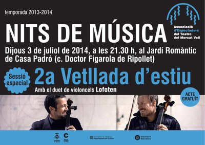 Aquest dijous, 3 de juliol, com a forma excepcional, es farà la sessió final de les Nits de Música. De nou, l'Associació d'espectadors repeteix la experiència de realitzar la trobada al Jardí Romàntic de la Casa Padró, a partir de les 21.30 hores. Actuaran els violoncel·listes Lofoten que barregen l´humor amb un repertori clàssic.