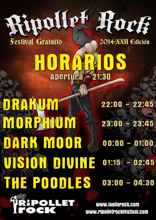 El Parc dels Pinetons acollirà, a les 23 h del divendres de Festa Major, una nova edició del Ripollet Rock Festival, que reuneix cada any més de 4.500 fans de la música rock. Les portes s'obriran a les 21.30 i el concert s'iniciarà a les 22 h, amb Drakum. A partir de les 23 h prendrà el relleu Morphium, seguits de Dark Moor a partir de la mitjanit. A partir de la 1:15 h sobre l'escenari es podrà veure els Vision Divine i tancaran la festa els The Poodles a partir de les 3 de la matinada. El festival, que és gratuït, arriba enguany a la seva 22a edició.Més informació a www.ripolletrockfestival.com.