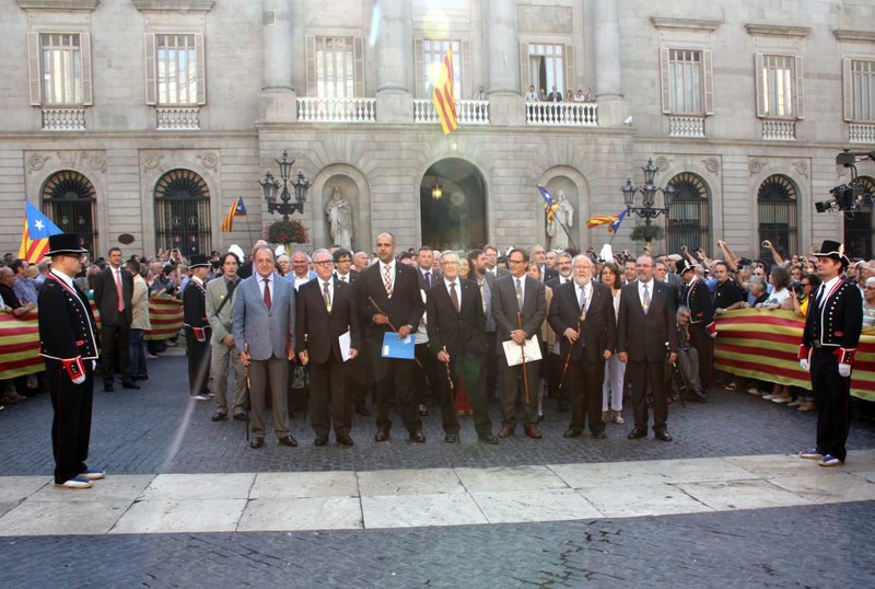 Mas va rebre els acords a favor del dret a decidir de mans dels representants de les set vegueries catalanes al Pati dels Carruatges del Palau de la Generalitat, ple de gom a gom. L'acte va comptar amb els parlaments dels presidents de les dues entitats impulsores de la moció, l'Associació Catalana de Municipis (ACM) i de l'Associació de Municipis per la Independència (AMI); així com de l'alcalde de Barcelona, Xavier Trias i el president de la Generalitat, Artur Mas. En acabar, els alcaldes van aixecar simbòlicament les seves vares. L'acte va cloure amb el cant dels Segadors, interpretat per la Coral Sant Cugat.