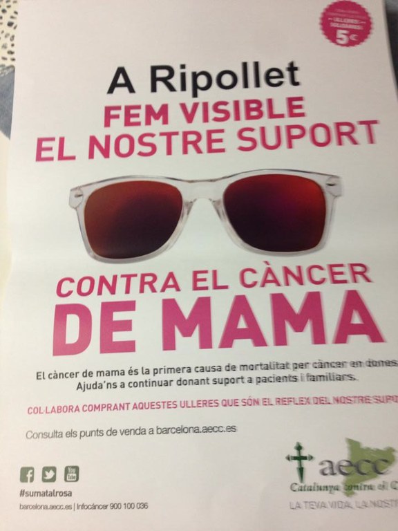 L'Aecc està portant a terme, dins la campanya Suma't al rosa, la iniciativa ulleres solidàries, amb l'objectiu de recaptar fons per a la recerca i per continuar donant suport psicològic i social a les persones afectades per aquesta malaltia. La secció local de Ripollet s'ha sumat a la campanya i el proper dissabte, 18 d'octubre, instal·larà un estand a la plaça de Pere Quart, entre les 10 i les 13.30 hores. L'objectiu era vendre les ulleres a un preu de 5 euros, però, com s'han esgotat, vendran altres materials solidaris contra el càncer de mama.