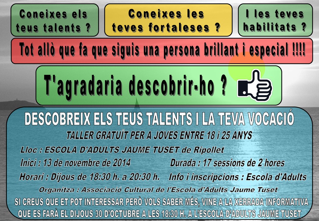 El CFA Jaume Tuset ha organitzat per al mes de novembre un nou taller amb l'objectiu de que els participants millorin el coneixement d'ells mateixos i s'estableixi un punt de partida per decidir el seu futur. Les persones interessades poden assistir, dijous 30 d'octubre, a la sessió informativa que tindrà lloc al centre, a les 18.30 h.Està destinat a joves d'entre 18 i 25 anys i és gratuit, tot i que les places són limitades. El taller tindrà una durada de 34 hores repartides en 17 sessions, els dijous de 18.30 a 20.30 h. Les inscripcions es faran del 3 a l'11 de novembre al CFA Jaume Tuset, a la Rambla dels Pinetons ,1.