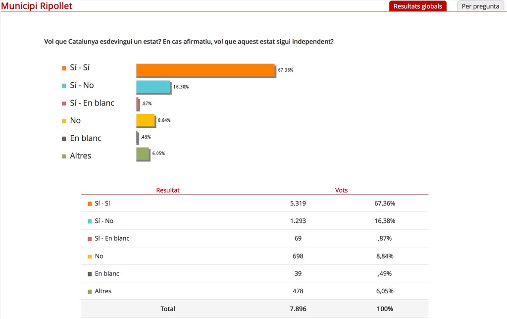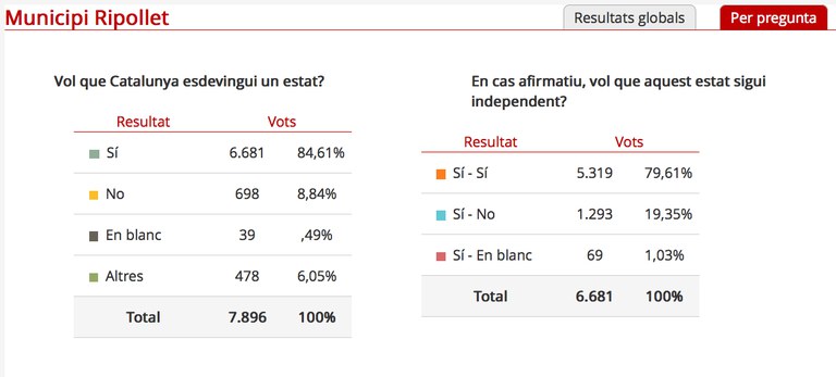 El No com a resposta el van triar 698 ripolletencs (8,84%) i en blanc van votar 39 persones (0,49%). Un total de 478 persones van donar altres respostes a la pregunta (6,05%).