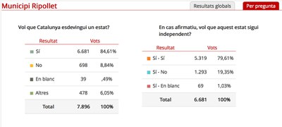 El passat diumenge els tres instituts de Ripollet van acollir la consulta del 9N. La jornada es va desenvolupar sense cap incidència i 7.896 ripolletencs van participar a la convocatòria. D'aquests, un 67,36% (5.319 votants) van optar pel Sí-Sí com a resposta a la pregunta 'Vol que Catalunya esdevingui un estat? En cas afirmatiu, vol que aquest estat sigui independent?'. El Sí-No va comptar amb un 16,83% (1.293 votants) i el Sí-en blanc va comptar amb el 0,87% (69 participants).