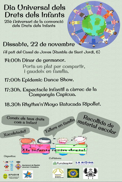 El dissabte, 22 de novembre, amb motiu del Dia Universal dels Drets del Infants, el Centre d'Esplai La Gresca, juntament amb la Regidoria de Joventut i Ciutadania de l'Ajuntament de Ripollet, el Centre d'Esplai l'Estel i Apadir, ha organitzat una jornada lúdica per donar a conèixer, mitjançant el joc i la diversió, els drets dels infants.