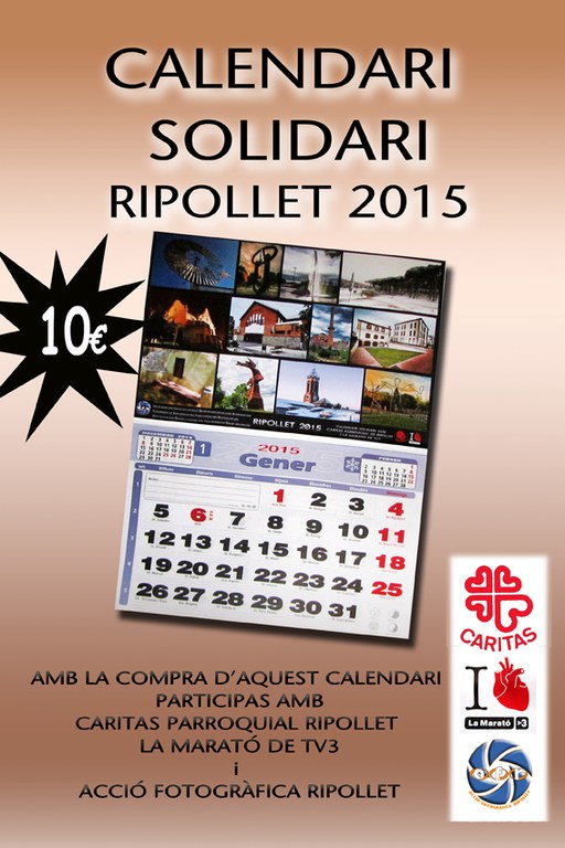 El president d'Acció Fotogràfica de Ripollet (AFR) va presentar el passat 15 de novembre a mossèn Josep Gassó, com a representant de Cáritas Parroquial de Ripollet, el calendari solidari 2015. Es tracta d'una iniciativa de AFR amb imatges de 12 espais emblemàtics del municipi, fetes per socis de l'entitat. Els diners recollits de la seva venda, a un preu de 10 euros, es destinarà a Cáritas Parroquial de Ripollet i a la Marató de TV3, dedicada aquest any a les malalties del cor.