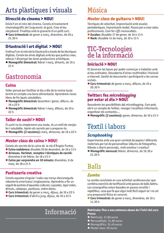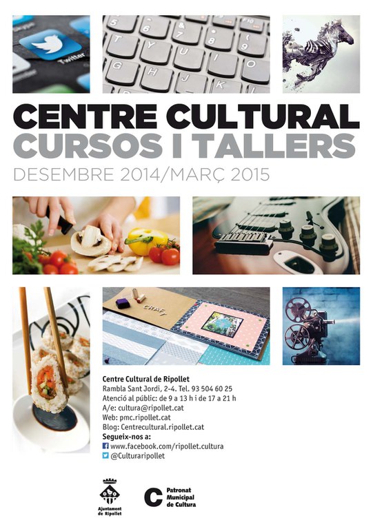 Entre els mesos de desembre de 2014 i març de 2015 el Patronat Municipal de Cultura posarà en marxa al Centre Cultural nous cursos i tallers. Entre la variada oferta, poden trobar tallers de sushi, zumba, srcapbooking i twitter, entre d'altres. També hi ha programades diverses masterclass. Els cursos comencen al desembre, gener i febrer. Les persones interessades poden dirigir-se al Centre Cultural. Les incripcions ja són obertes. Més informació als documents adjunts.