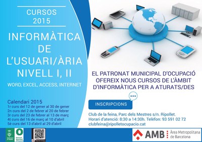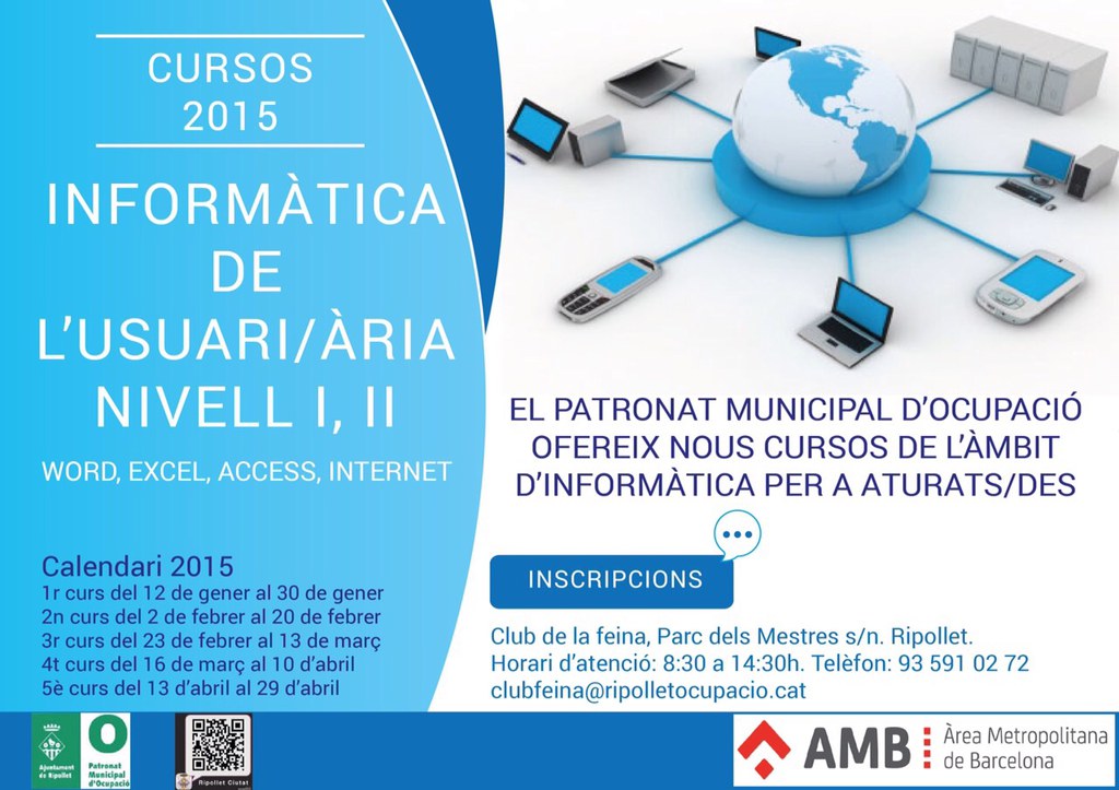 El Patronat Municipal d'Ocupació ofereix des del passat 12 de gener i fins a finals d'abril diversos cursos d'informàtica de l'usuari i d'atenció al públic en anglès adreçats a les persones aturades del municipi. En els cursos d'informàtica es treballaran programes com Word, Excel i Access així com l'ús d'internet. Trobareu les dates disponibles a les imatges adjuntes. Les inscripcions s'han de realitzar al Club de la Feina, al Parc dels Mestres, s/n de Ripollet. L'horari d'atenció és de 8.30 a 14.30 h. El telèfon és el 93 591 02 72 i el correu electrònic clubfeina@ripolletocupacio.cat.
