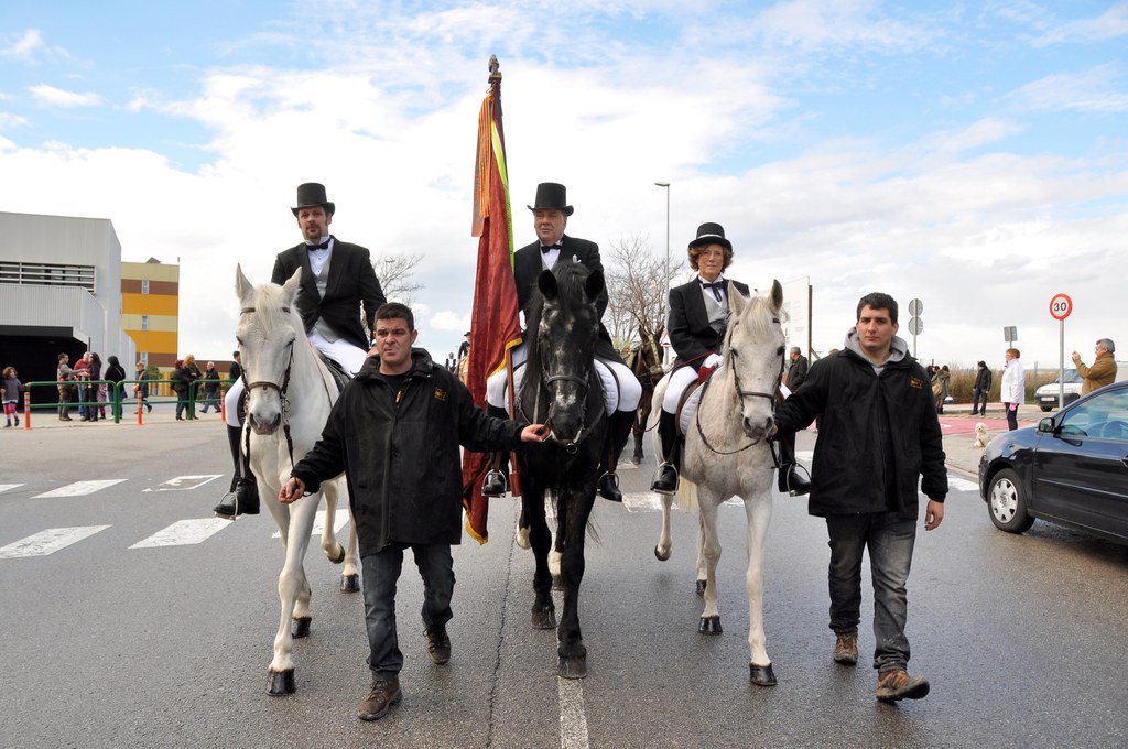 El portador de la bandera, Josep Grau Sastre, acompanyat de Marta Gotarda i Abigail de la Cueva, encapçalaran la passada amb el carruatge de la comissió amb la figura de Sant Antoni Abat.
