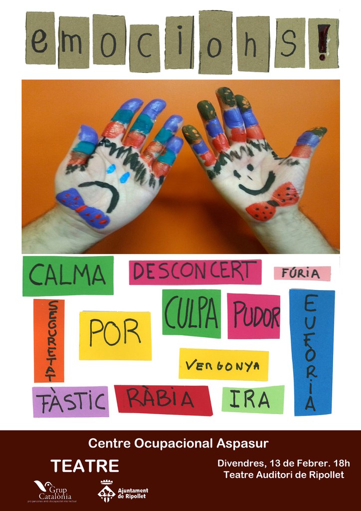 Aspasur presentarà, el proper 13 de febrer a les 18 h, al Teatre Auditori del Mercat Vell l'obra Emocions. L'amor, la por, la tristesa o l'alegria són emocions importants i necessàries a la nostra vida. Cadascuna d'elles desenvolupa una funció concreta. Els participants en l'espectacle donen vida i personalitat a aquests sentiments. Serà a càrrec dels usuaris del Centre Ocupacional Aspasur que sumen un total de 41 participants. L'entrada és gratuïta i oberta a tothom.