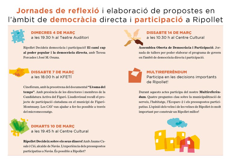 A més, durant tota la quinzena es podrà participar al Multireferèndum de Decidim Ripollet. Quatre preguntes clau sobre la municipalització de serveis, l'habitatge, l'Ecoparc-2 i els pressupostos participatius.