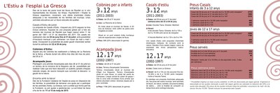 Per altra banda, també hi ha la possibilitat d'inscriure's en les colònies infantils i juvenils. Els infants de 3 a 12 anys sortiran de colònies els darrers dies de juliol, del 29 al 31 de juliol. Realitzaran la sortida a la Rectoria de la Selva, al terme municipal de Navès. Els joves, d'entre 12 i 17 anys, aniran al terreny d'acampada Camarassa, a la Noguera, del 26 al 31 de juliol. Tota la informació relativa als preus i els horaris es pot consultar a la pàgina web de l'Esplai La Gresca.