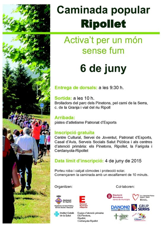 Tot i que la participació en la caminada és gratuïta, cal inscripció prèvia al Centre Cultural, Patronat municipal d'Esports, Casal d'Avis, als CAPS Ripollet, Pinetons i Farigola, i als departaments municipals d'Educació, Serveis Socials i Salut Pública, fins el dia 4 de juny.