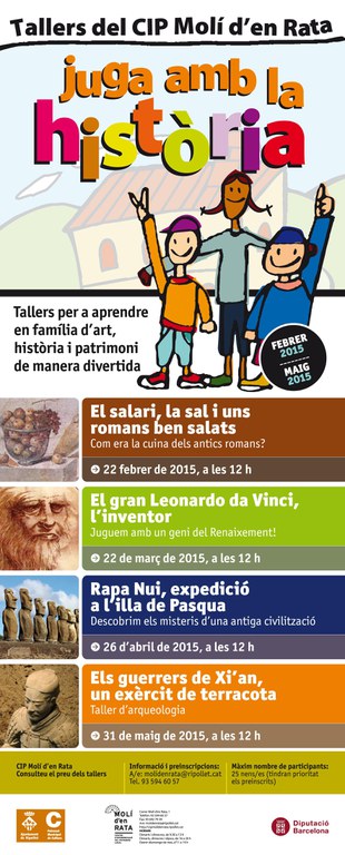 El CIP Molí d'en Rata tancarà el proper diumenge, 31 de maig, el cicle de tallers mensuals Juga amb la història 2014-2015 i ho farà amb l'activitat 'Els guerrers de Xi'an, un exèrcit de terracota'. Els participants aprendran com el primer emperador de la Xina va manar construir la que seria una de les tombes més grans del món i, per protegir-la, va reproduir tot el seu exèrcit en figures de fang de mida real. A més, els participants podran fer el seu propi guerrer de terracota.