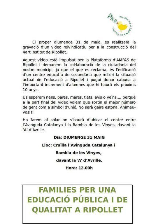 Aquest diumenge, 31 de maig, la Plataforma d'AMPA de Ripollet (PAR) ha convocat la ciutadania per gravar un vídeo reivindicatiu per a la construcció del 4t institut.