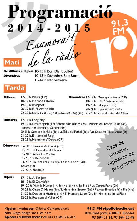La programació 2014-2015 de Ripollet Ràdio finalitza el pròxim 28 de juny i com cada estiu s'obre l'entrada de projectes de nous programes, de cara a la seva incorporació a la nova temporada, que comença al setembre.