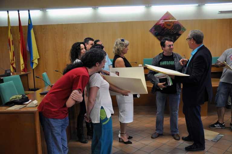 - moment del lliurament de la litografia: l'alcalde sortint, Juan Parralejo, amb Toni Pijuan (CpR) i a l'esquerra el futur alcalde José María Osuna.