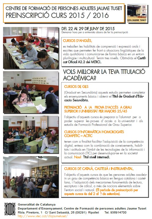 El 22 de juny comença el període de preinscripció per a l'Escola d'Adults Jaume Tuset. El centre oferirà ensenyaments d'anglès, informàtica, graduat de secundària i preparació per als accessos a cicles formatius de grau mitjà, superior i a la universitat.