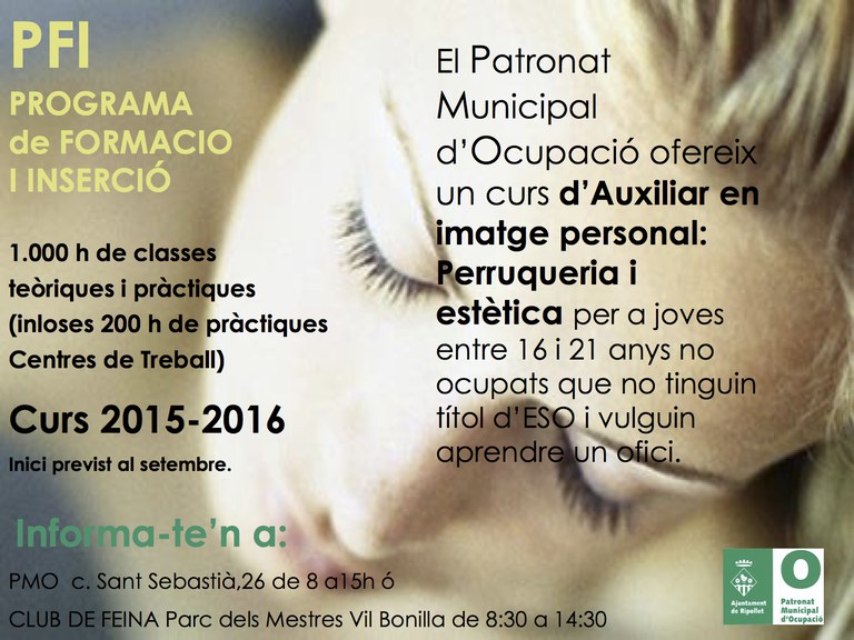 El curs és previst que comenci al setembre i consistirà en mil hores de classe teòriques i pràctiques, incloses 200 hores de pràctiques en centres de treball. Per obtenir més informació, cal adreçar-se al PMO de vuit del matí a tres de la tarda, o al Club de la Feina de dos quarts de nou del matí a dos quarts de tres de la tarda.