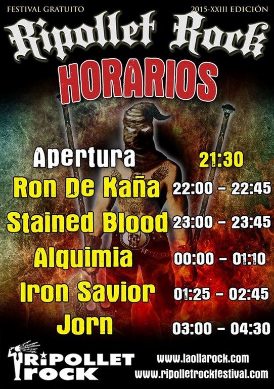 L'obertura de les portes per accedir als concerts serà a dos quarts de deu de la nit, i el primer concert començarà a les 22 hores, a càrrec dels Ron de Kaña. A les 23 hores serà el torn de Stained Blood, i una hora després pujarà a l'escenari Alquimia. Iron Savior iniciarà el seu concert a les 1.25 hores i el festival tindrà el seu punt culminant a les tres de la matinada amb la irrupció de Jorn, cap de cartell d'enguany.