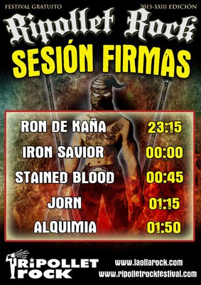 Tots els grups que participen al Ripollet Rock Festival s'han ofert a l'organització per preparar unes sessions de firmes, on estamparan la seva rúbrica als discos o les samarretes dels assistents. Aquestes sessions de signatures començaran a les 23.15 h. i es realitzaran al llarg de la nit: Ron de Kaña (23.15 h.), Iron Savior (0.00 h.), Stained Blood (0.45 h.), Jorn (01.15 h.) i Alquimia (01.50 h.).