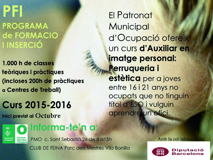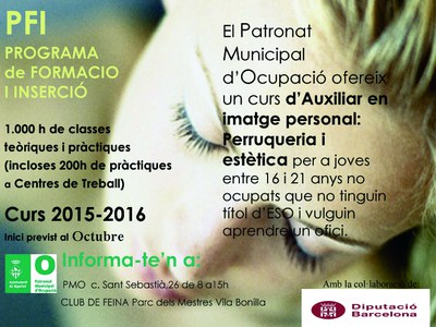 A partir d'aquest mes d'octubre es tornarà a realitzar el curs del Programa de Formació i Inserció (PFI) de l'especialitat d'Auxiliar en imatge personal, centrat en la Perruqueria i l'Estètica. Es tracta d'un curs d'un total de 1.000 hores de classes teòriques i pràctiques, que inclou també 200 hores de pràctiques a Centres de Treball. El curs comença a mitjans d'octubre, i els interessats es poden inscriure fins a finals d'aquest mes. Per a més informació, cal adreçar-se al Patronat d'Ocupació (carrer de Sant Sebastià, 26) de 8 a 15 hores; o al Club de Feina, situat al parc dels Mestres.