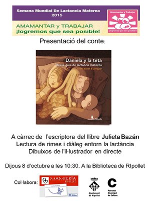 Per altra banda, la Biblioteca Municipal acollirà dijous, 8 d'octubre, la presentació del conte 'Daniela y la teta', de Julieta Bazán i il·lustrat per Javigaar. L'acte, que començarà a dos quarts d'onze del matí, comptarà amb la lectura de rimes i hi haurà un diàleg sobre la lactància.