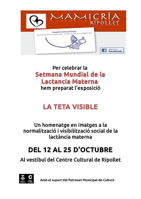 Finalment, el Centre Cultural acollirà, del 12 al 25 d'octubre, una mostra d'imatges que pretenen homenatjar la normalització i la visibilització social de la lactància materna. L'exposició, organitzada per Mamicria Ripollet sota el títol 'La teta visible', vol celebrar la Setmana Mundial de la Lactància Materna.