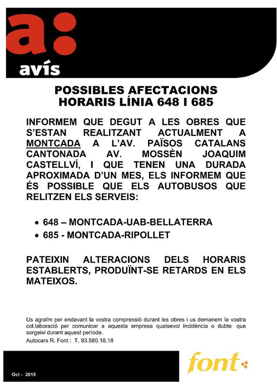 L'empresa Autocars R. Font ha informat que podria haver alteracions en els horaris de les línies 648 (Montcada-UAB-Bellaterra) i 685 (Montcada-Ripollet) a causa d'unes obres que s'estan realitzant a Montcada. Aquests treballs tenen una durada aproximada d'un mes.