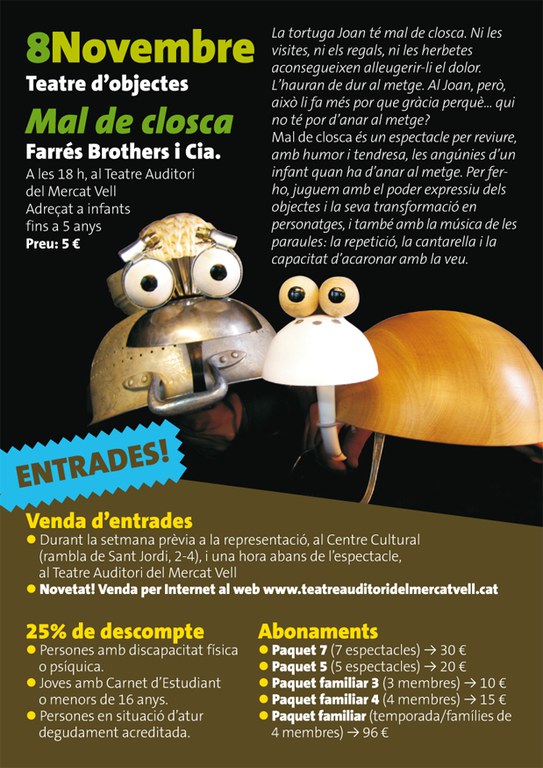 El Teatre Auditori del Mercat Vell acollirà diumenge, 8 de novembre, l'espectacle infantil 'Mal de closca', a càrrec de la companyia Farrés Brothers. Serà a partir de les sis de la tarda i està adreçat a infants de fins a cinc anys.