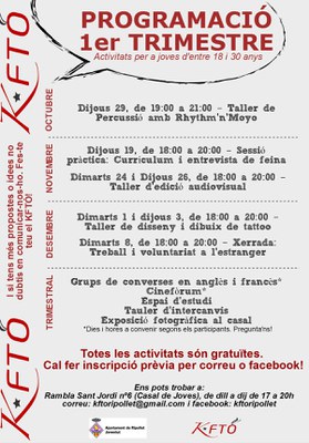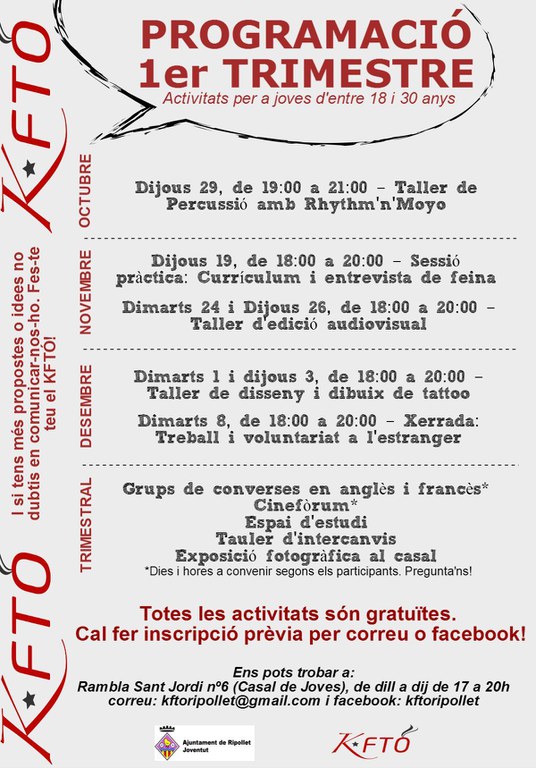 El taller forma part de les activitats del Kftó per a aquest trimestre, les quals van adreçades a joves d'entre 18 i 30 anys. Per a aquest novembre també hi ha previst un taller d'edició audiovisual. Es farà en dues sessions, els dies 24 i 26, i també de sis de la tarda a vuit del vespre.