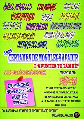 El Teatre Auditori del Mercat Vell es va omplir de gom a gom diumenge, 15 de novembre, per assistir al quart Certamen de Monòlegs que organitzava Apadir, l'associació de persones discapacitades físiques, psíquiques i sensorials de Ripollet. Fonts de l'entitat asseguren que ha estat l'edició que ha comptat amb més públic i on van recollir més d'un miler d'euros que destinaran a alguns dels seus projectes, com ara equinoteràpia, teràpia amb gossos o musicoteràpia. A més, Apadir realitza un esplai setmanal, els dissabtes de 10.30 a 13 hores, a l'escola Escursell.