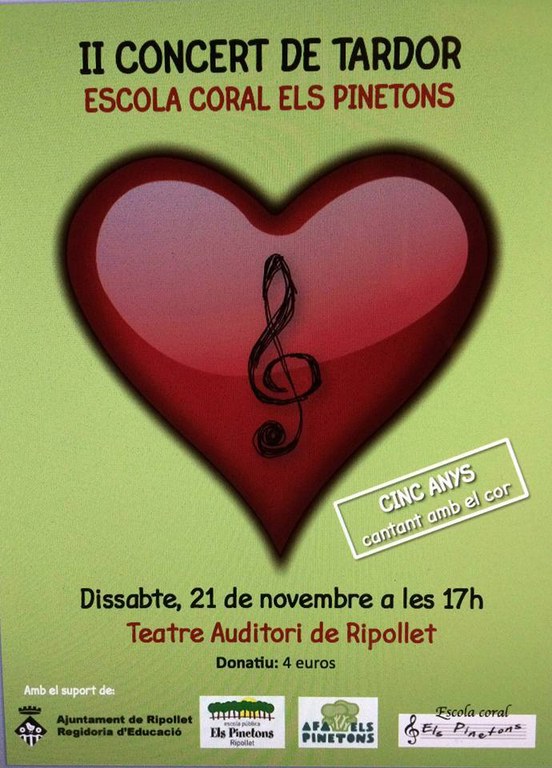 La coral de l'escola Els Pinetons celebra aquest dissabte, 21 de novembre, la segona edició del seu Concert de Tardor. Serà a partir de les 17 hores al Teatre Auditori del Mercat Vell. La venda d'entrades es realitzarà el mateix dia de l'espectacle, de 11.30 a 12.30 h i de 16 a 17 h. El preu dels tiquets serà de quatre euros.