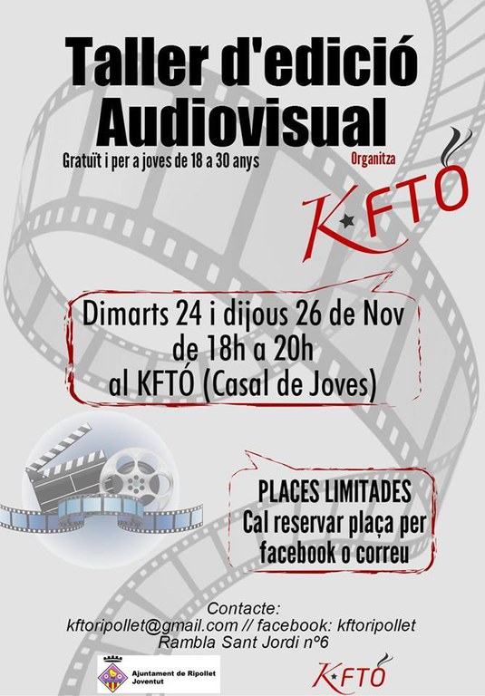 El taller d'edició audiovisual és un curs gratuït de quatre hores en total, que organitza la Regidoria de Joventut. Cal inscripció prèvia al correu kftoripollet@gmail.com o a través del Facebook kftoripollet.