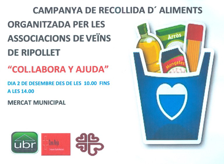 Sota el lema 'Col·labora i ajuda', les associacions de veïns de Ripollet duen a terme una campanya de recollida d'aliments que compta amb el suport de la Unió de Botiguers de Ripollet (UBR). Les donacions es poden aportar a les seus de totes les entitats veïnals, fins al 17 de desembre, de 10 a 21 hores. Aquestes es faran a arribar a Càritas.