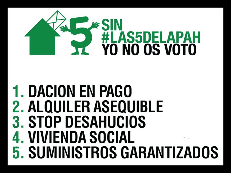 Els activistes demanen a les diferents candidatures la dació en pagament retroactiva, el lloguer assequible, la paralització dels desnonaments, lloguer social dels habitatges buits i la garantia dels subministraments bàsics com aigua, llum i gas. Per a la Plataforma, es tracta d'una exigència de mínims "per a acabar amb el context d'emergència habitacional que ens ha deixat la banca, les subministradores i la manca de polítiques de PP i PSOE".