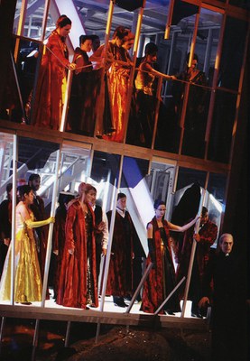 El paper de Lucia està interpretat per la prestigiosa soprano romanesa Elena Mosuc. Per altra banda, aquesta obra es tracta del debut mundial del tenor peruà Juan Diego Florez en el rol d'Edgardo. L'escenografia, basada en una torre inclinada de vidre, és un paisatge de destrucció i desolació, tot recordant que Escòcia està en guerra, esquinçat per les ambicions dels clans rivals. La música i els cors estaran interpretats per l'Orquestra Simfònica i el Cor del Gran Teatre del Liceu, dirigit per Peter Burian.