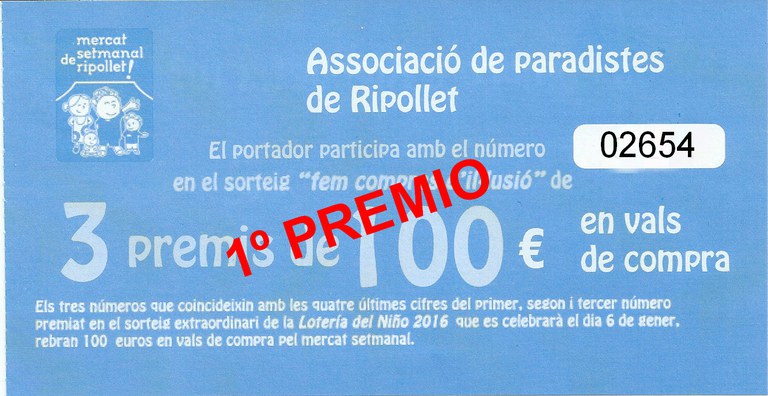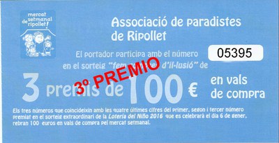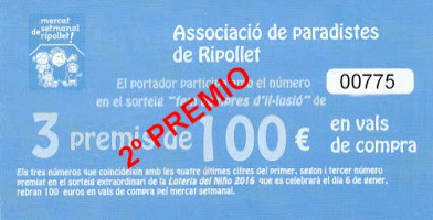 Durant aquests dies de Nadal, l'Associació de Paradistes de Ripollet han venut butlletes per participar en el sorteig 'Fem compres d'il·lusions 2015-16'. Els veïns i veïnes de Ripollet els han pogut adquirir en les diverses parades del mercat setmanal. Els participants del sorteig ja poden comprovar si han estat agraciats o no, ja que els números premiats coincideixen amb els primers tres premis del sorteig de la Loteria del Nen. El premi consisteix en 3 premis de 100 euros en vals de compres.