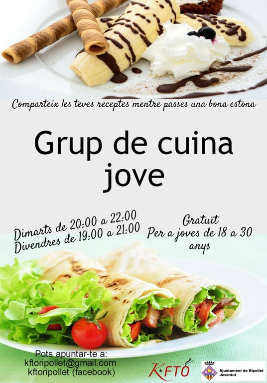 La Regidoria de Joventut inicia, a partir de dimarts 19 de gener, un grup de cuina jove. Els joves ripolletencs, de 18 a 30 anys, estan convidats a assistir-hi i compartir les seves receptes, a més de passar una bona estona, amb la resta de membres del grup. Hi haurà dos grups de cuina jove, que es reuniran al Casal de Joves els dimarts, de 20 a 22 hores i els divendres, de 19 a 21 hores.