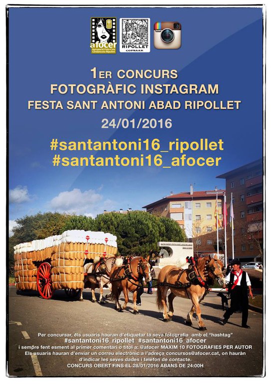 L'associació fotogràfica AFOCER organitza el primer concurs d'Instagram amb la temàtica de la festa de Sant Antoni Abat del pròxim diumenge 24 de gener. Tots els assistents a la festa podran compartir les seves millors fotografies, fent servir les etiquetes #santantoni16_ripollet o bé #santantoni16_afocer i esmentant al títol o al primer comentari a @afocer. És requisit indispensable que els concursants siguin seguidors d'Afocer a la xarxa d'Instagram.