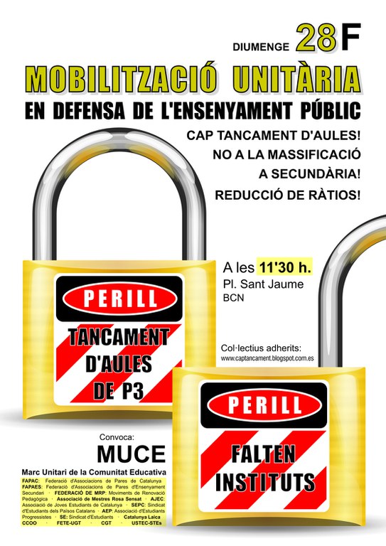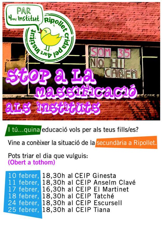 En aquestes xerrades dirigides als pares i mares (que continuaran dimecres vinent a l'escola Escursell, i dijous a Tiana), els membres de la Plataforma els animen també a sumar-se als actes reivindicatius per aconseguir el quart institut a Ripollet, ja sigui fent extensiva la problemàtica de la massificació a tothom qui la desconegui, o bé penjant pancartes de protesta als balcons. A més, van convocar-los a assistir a la mobilització en defensa de l'ensenyament públic que ha organitzat el Marc Unitari de la Comunitat Educativa (MUCE) per a aquest diumenge, 28 de febrer, a dos quarts de dotze del matí, a la plaça Sant Jaume de Barcelona.