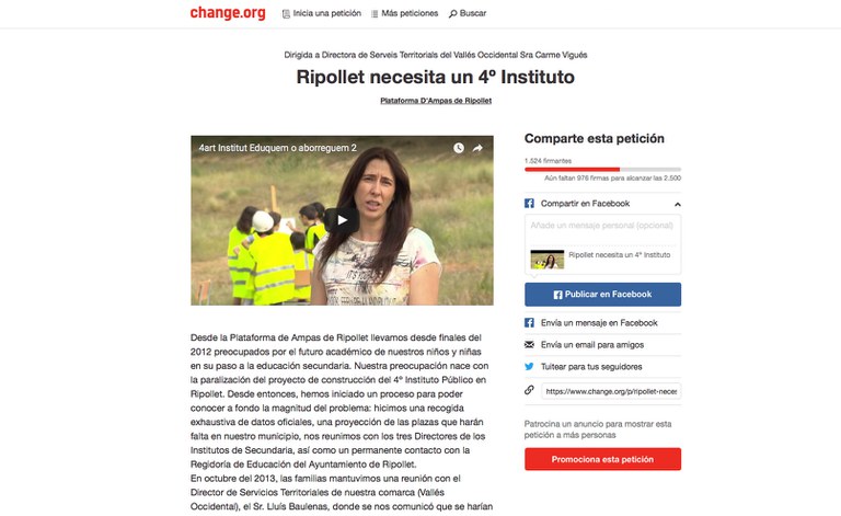La Plataforma d'AMPA Públiques de Ripollet (PAR) va iniciar la setmana passada una campanya de recollida de firmes per reclamar la construcció del 4t institut a la vila. La iniciativa s'està duent a terme a través de Change.org, que utilitza les xarxes socials per estendre més ràpidament qualsevol petició. En menys d'un dia, divendres 19 de febrer, ja s'havien superat la xifra de les 1.000 adhesions. Aquest dilluns, 22 de febrer, ja s'han superat les 1.500.