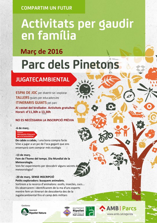 Les activitats de la Jugatecambiental es reprenen aquest diumenge, 28 de febrer, amb una gran Festa de benvinguda. Durant tot el matí es realitzaran activitats diverses, com ara tallers de reciclatge; un taller de pintar-se la cara per semblar un dels animals del parc i un esmorzar ecològic. La cita serà, com sempre, al brollador del parc dels Pinetons, a partir de les 11.30 hores fins a les 13.30 h. No cal inscripció prèvia i l'activitat és gratuïta.