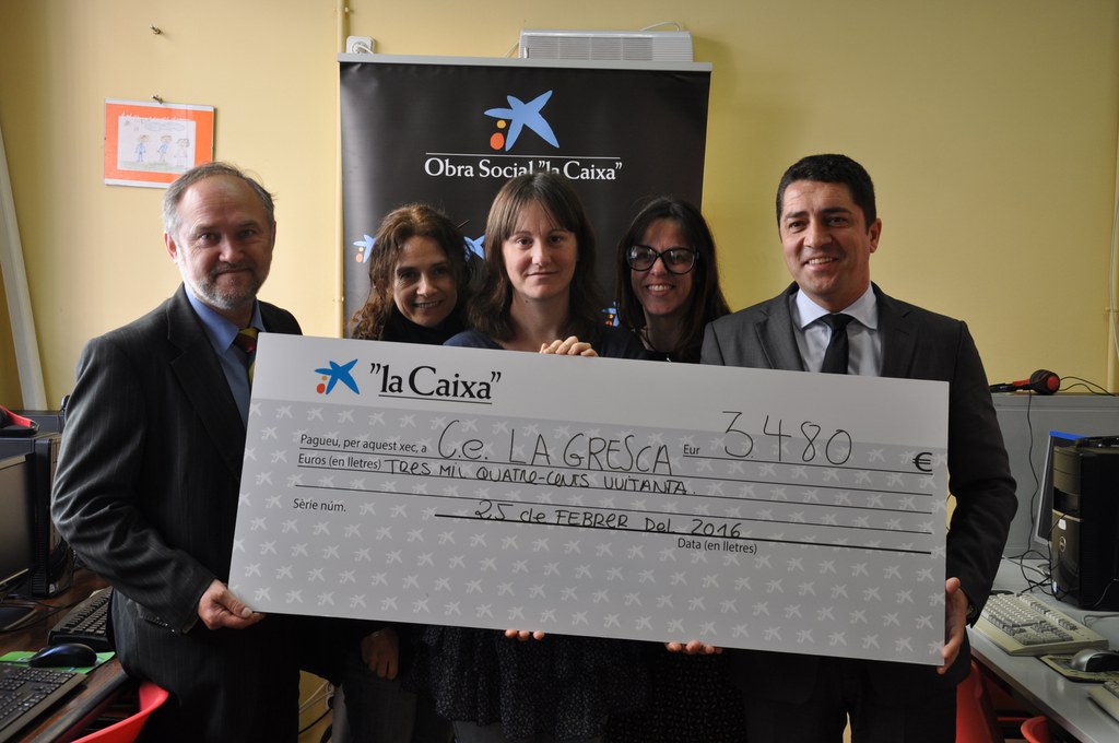 A la imatge: Jordi Vallespí, Director de l'oficina de Caixabank del Mercat Nou; Agustí Cañellas, Director de l'Àrea de Negoci del Vallès Sud de Caixabank; Andrea González, dinamitzadora de l'aula d'informàtica de La Gresca, i Graci Mora i Marta Buixó, codirectores de La Gresca.