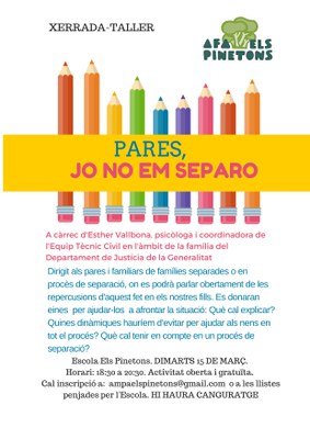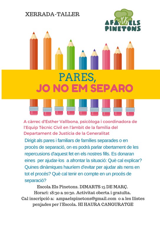 L'Associació de Familiars d'Alumnes Els Pinetons organitza el taller Pares, jo no em separo. Es tracta d'una activitat oberta i gratuïta dirigida als pares i familiars separats o en procés de separació, que tindrà lloc aquest 15 de març de 18.30 a 20.30 h. La intenció del taller és donar a conèixer eines per ajudar a afrontar la situació, proporcionant les pautes necessàries per saber què explicar als fills, dinàmiques que s'haurien d'evitar per ajudar els nens i les coses a tenir en compte en el procés de separació. La xerrada estarà dirigida per Esther Vallbona, psicòloga en l'àmbit de la família del Departament de Justícia de la Generalitat.