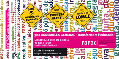 Aquest dissabte, 12 de març, al matí, les AMPA estan convocades a participar en la 38a Assemblea General de la Fapac, que se celebrarà a l'Escola Els Pinetons. Es tracta de la trobada anual de la Federació d'Associacions de Pares i Mares d'Alumnes de Catalunya, que representa a unes 2.200 AMPA d'escoles públiques catalanes. També és una oportunitat per enfortir i cohesionar els lligams entre les diferents entitats. Enguany, el lema de l'assemblea és 'Transformem l'educació', per deixar palès que les famílies són una peça clau per a la bona marxa de les escoles i per incidir en les polítiques, amb l'objectiu de garantir una millor educació.