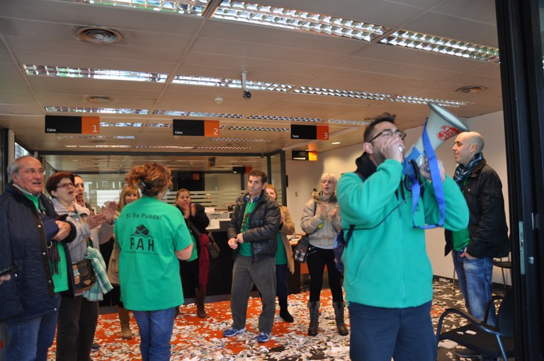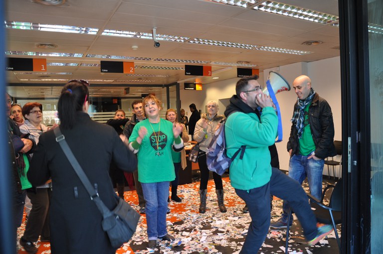 Es tracta d'una acció indefinida, en la qual ocuparan aquestes dependències del banc o en altres municipis fins que es trobi una solució a la situació concreta de la María Ángeles, veïna de Ripollet. La M. Ángeles va comprar un pis fa 13 anys amb la seva parella amb una hipoteca de 140.000 euros. Uns anys més tard, va ficar-se en una altra hipoteca amb el seu fill per a comprar el seu pis i el va avalar amb una càrrega de 50.000 euros en la hipoteca del seu anterior pis. La mort del seu marit va deixar la María Ángeles en una situació financera molt delicada. Va realitzar la reunificació de prèstecs, i una de les hipoteques va passar a ser responsabilitat de l'empresa Blaston. Malgrat la dificultat de la situació, després de negociar dos anys amb Blaston, ha aconseguit la dació en pagament del pis del seu fill, que ara viu amb ella. A més, Blaston ha condonat el deute de 50.000 euros que va contraure com a aval en la seva primera hipoteca.