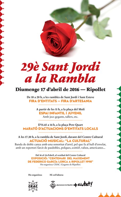 Vegeu la programació completa del Sant Jordi a Ripollet 2016 a la notícia i programa relacionat a sota.
