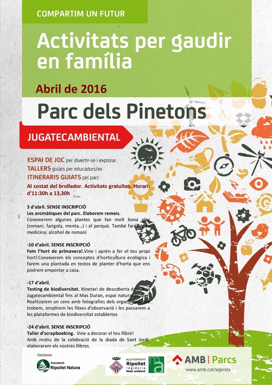 Aquest diumenge, 24 d'abril, s'organitza la darrera sessió de la Jugatecambiental del mes d'abril. En aquesta ocasió, l'activitat estarà relacionada amb Sant Jordi i consistirà en la decoració de llibres amb flors, scrapbooking. Es tracta d'un taller creatiu que empra elements vegetals per decorar llibres. El lloc de trobada és a les 11.30 h al brollador del Parc dels Pinetons.