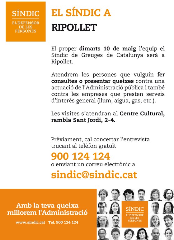 L'equip del Síndic de Greuges visitarà Ripollet aquest dimarts, 10 de maig, i s'instal·larà durant tot el matí al Centre Cultural. Totes aquelles persones que vulguin presentar alguna queixa o consulta sobre l'Administració pública s'hi podran acostar i presentar la seva reclamació.