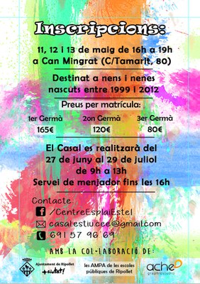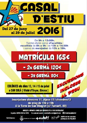 El Centre d'Esplai La Gresca i el Centre d'Esplai L'Estel obren aquesta setmana el termini de les inscripcions per al Casal d'Estiu 2016. Des d'aquest dilluns, 9 de maig, fins al 13 de maig, La Gresca realitzarà les inscripcions al Casal de Joves (rbla. de Sant Jordi, 6), de 17 a 20 hores. Per la seva banda, L'Estel realitzarà les inscripcions de l'11 al 13 de maig a la seu de l'entitat, a la Torre Can Mingrat (carrer de Tamarit, 80), de 16 a 19 hores.